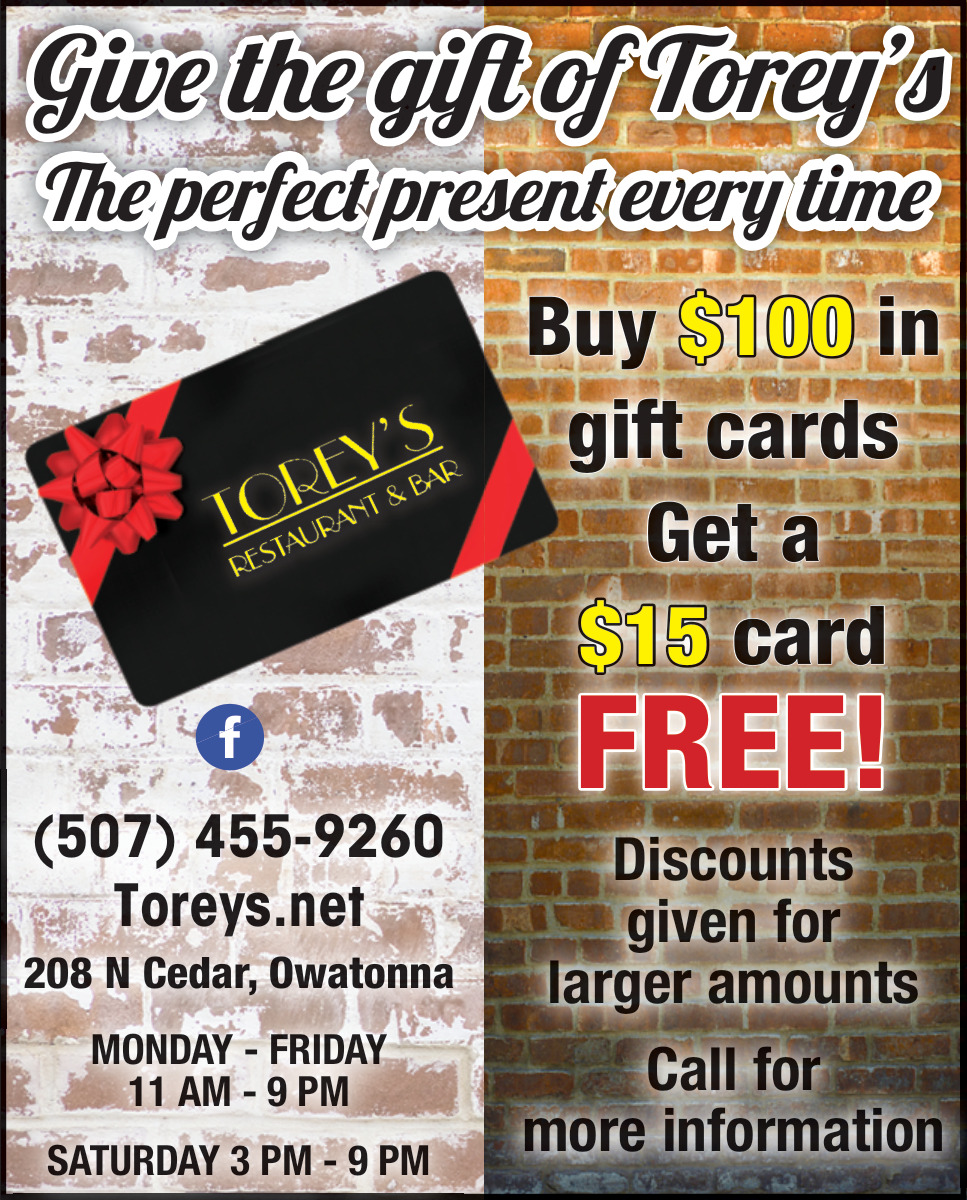 Dec 06, 2025. Torey's Restaurant & Bar Restaurants Ads from Owatonna Peoples Press