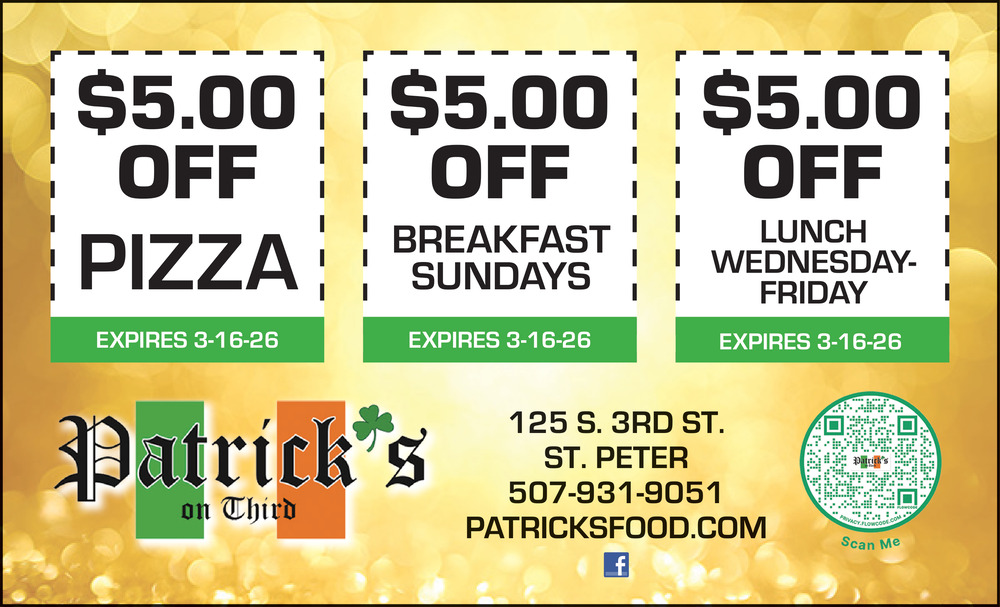 Feb 12, 2026. Patrick's on Third Restaurants Ads from St Peter Herald