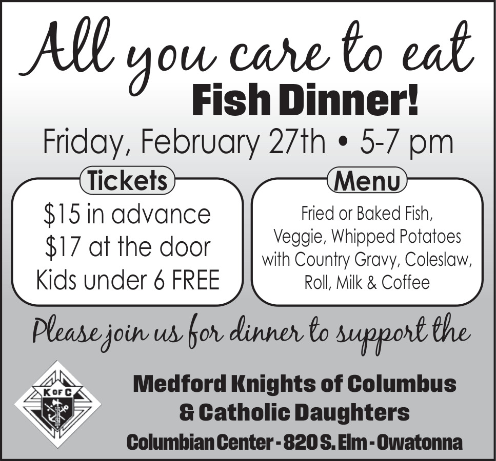 Feb 25, 2026. Medford Knights of Columbus & Catholic Daughters Fish Dinner (March 14, 2025) Events Ads from Owatonna Peoples Press
