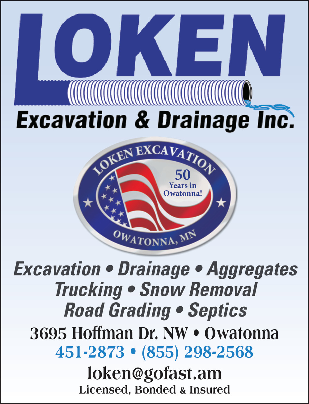 Mar 14, 2026. Loken Excavation & Drainage Inc Construction Ads from Owatonna Peoples Press