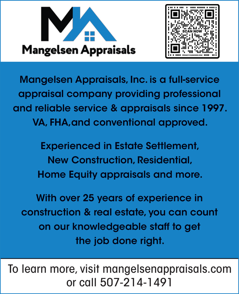 Mar 25, 2026. Mangelsen Appraisals, Inc. Finance & Insurance Ads from Owatonna Peoples Press