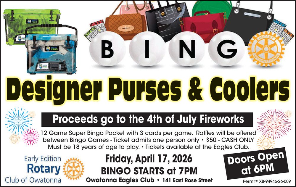 Apr 07, 2026. Designer Purses & Coolers at Owatonna Eagles Club Events Ads from Owatonna Peoples Press