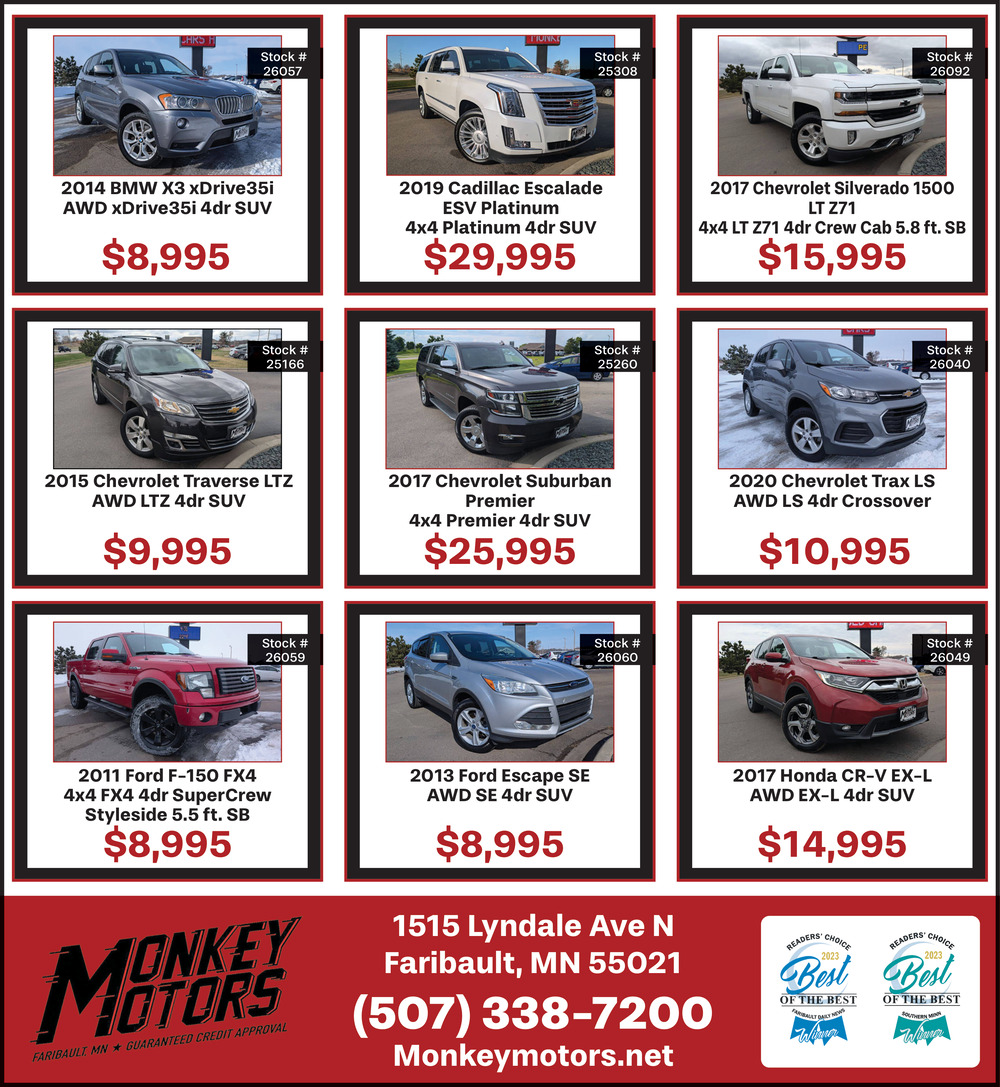 Apr 07, 2026. Monkey Motors Auto Dealers Ads from Owatonna Peoples Press