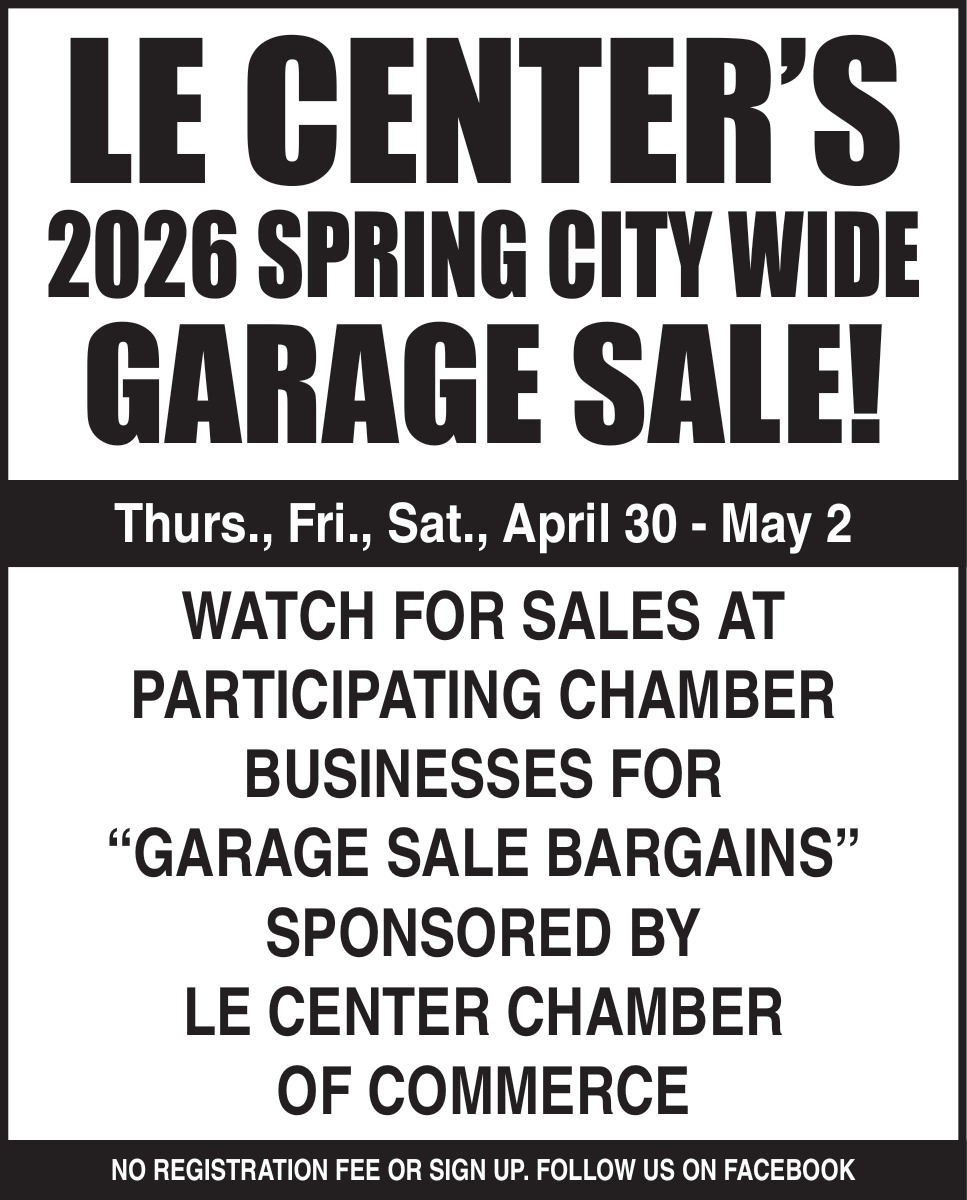 Apr 16, 2026. Le Center's 2026 Spring City Wide Garage Sale! Events Ads from St Peter Herald