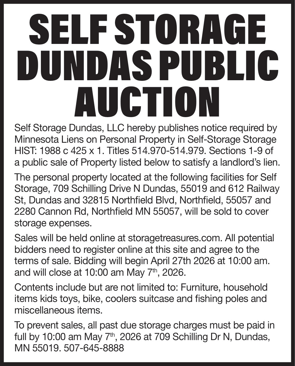 Apr 21, 2026. Self Storage Dundas Storage Ads from Southern Minn Media