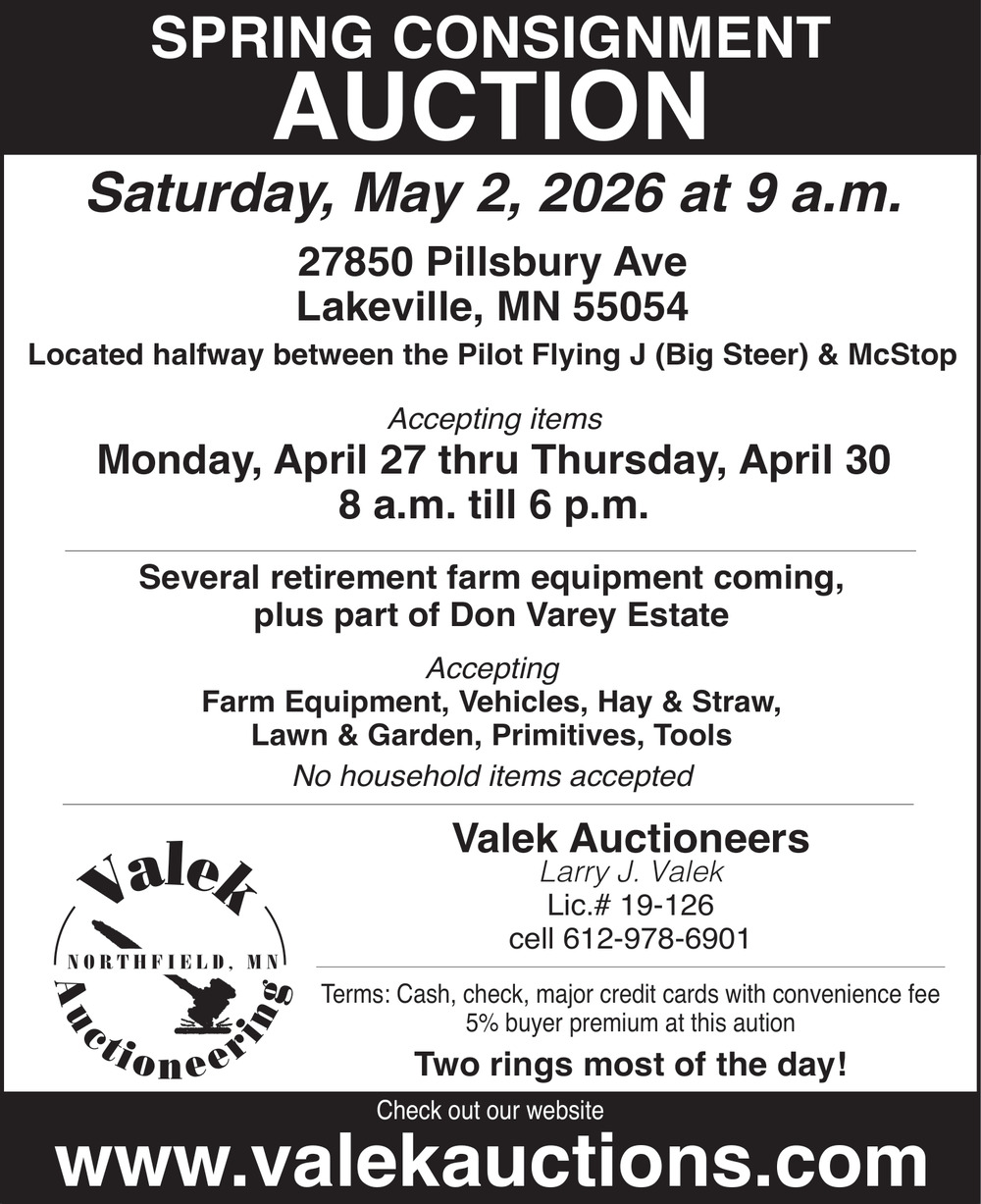 Apr 25, 2026. Valek Auctions Auctions Ads from Faribault Daily News